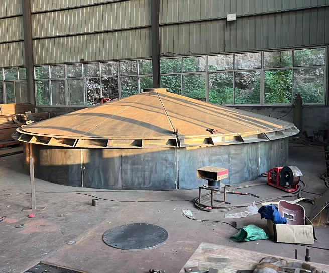 1、門體的圓錐形蓋與圓筒形立壁及外密封圈焊接成一體,圓錐形防爆蓋分為扇形弧面結(jié)構(gòu)的8塊,遠(yuǎn)程智能自復(fù)式立井防爆門的各塊之間加膠墊用螺栓緊固,主要材料為75x50x5角鋼、Q235厚度4毫米鋼板;20x80mm硅膠密封條。